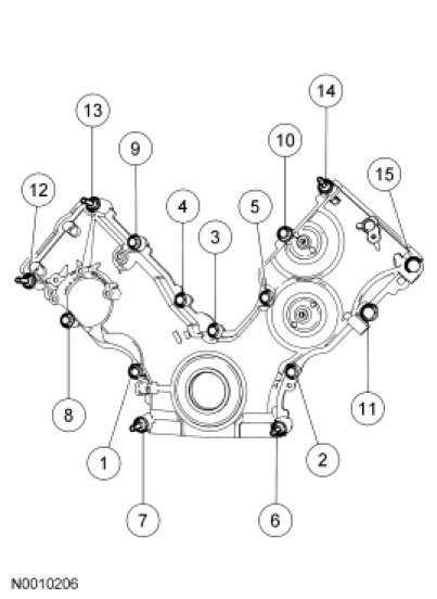 Tighten the 15 engine front cover fasteners in the sequence shown in 2 stages.