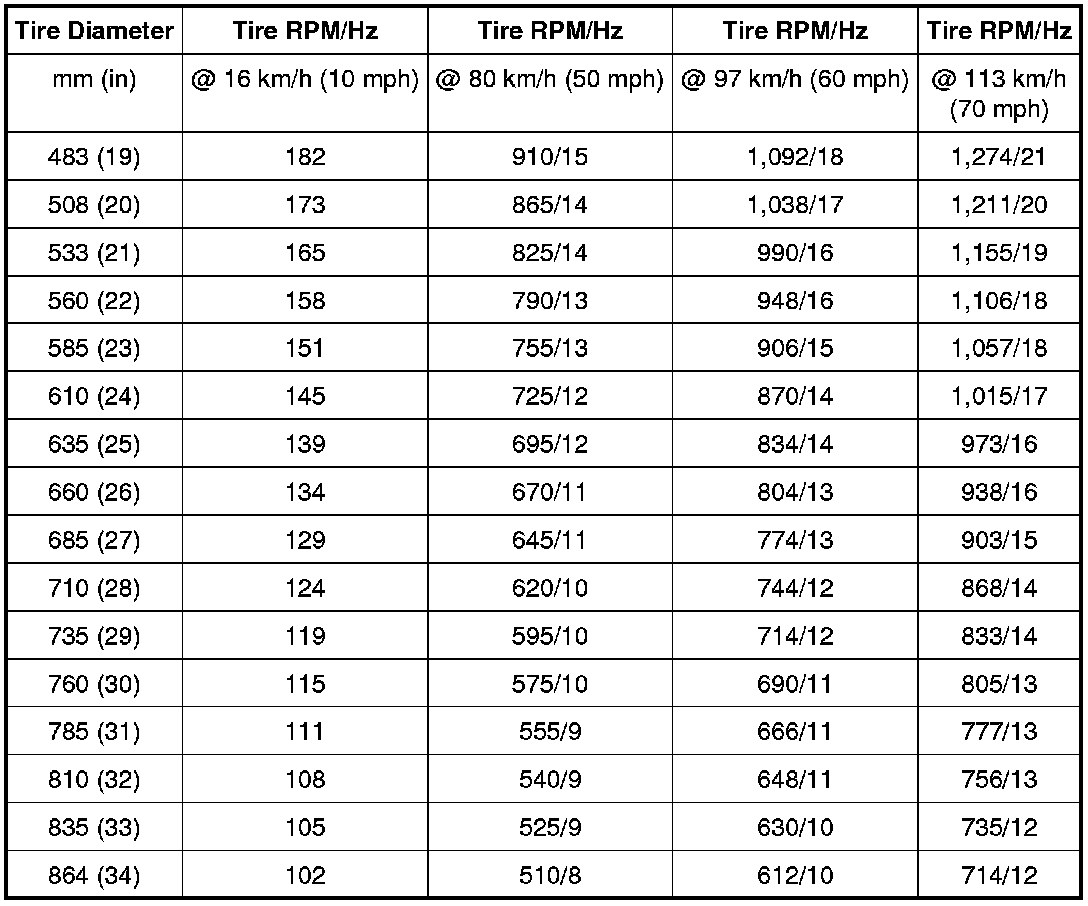 - If the vehicle speed is not listed, calculate the tire and wheel frequency as follows: