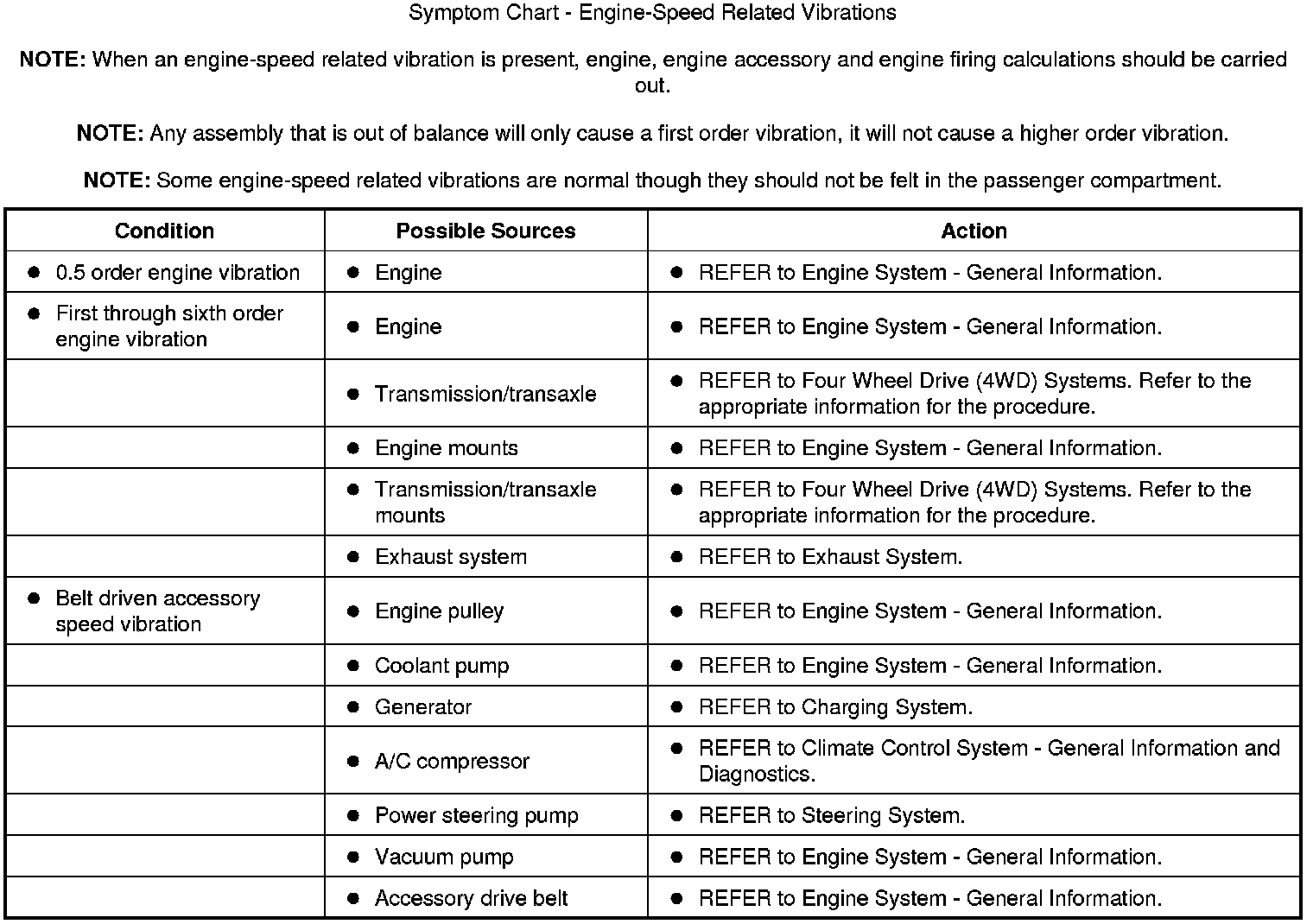 Use the diagnostic instructions along with the necessary listed tools to identify the vibration order and to isolate the symptom and the possible systems associated with that symptom. Then based on the results from the road test, make a determination of which action in the symptom chart to take first. Since it is possible any one of multiple systems may be the cause of the symptom, it may be necessary to use a process of elimination type diagnostic approach to pinpoint the concern. Refer to the indicated information to identify and isolate the cause or rule that system out as being the causal system for the symptom.