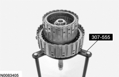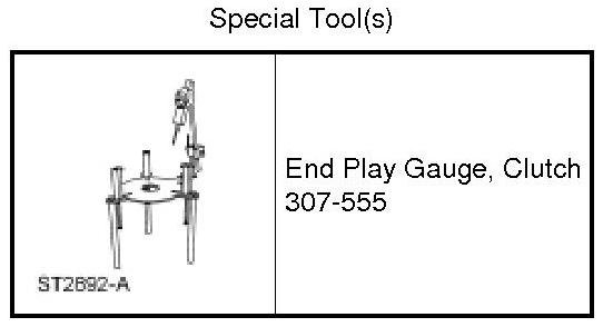 1. Position the forward clutch assembly in the Clutch End Play Gauge 307-555 and install the overdrive clutch pack onto the forward clutch and planetary gear set.