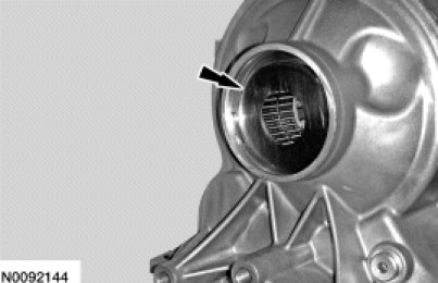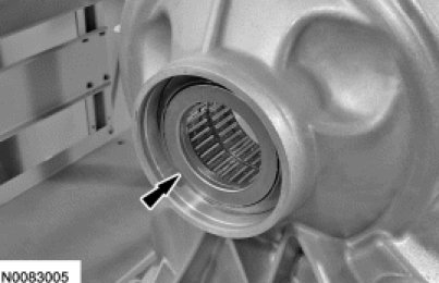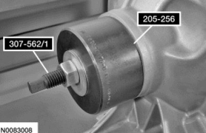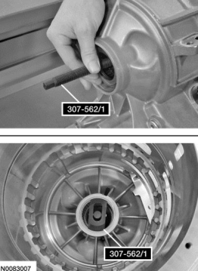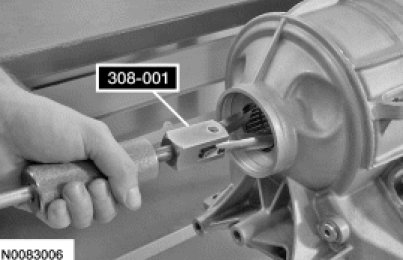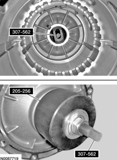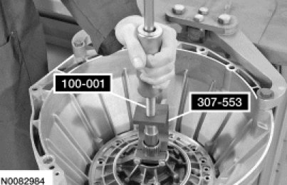 45. NOTICE: Use care when installing the Needle Bearing Remover 307-562. Look inside the transmission case to make sure that the Needle Bearing Remover 307-562 contacts the bearing only and not the lip of the case, or damage to the case will occur.