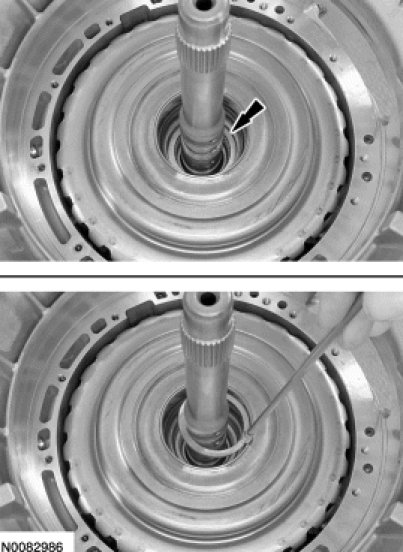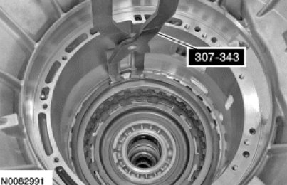 23. Using the Retaining Ring Pliers 307-343, remove the center support snap ring.