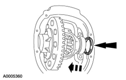 36. To decrease the backlash, install a thicker differential bearing shim and a thinner differential bearing shim as shown.