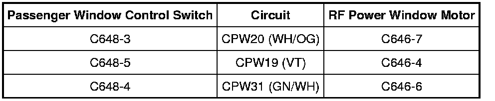 - Measure the resistance between RF power window motor C646, harness side and passenger window control switch C648, harness side using the following chart: