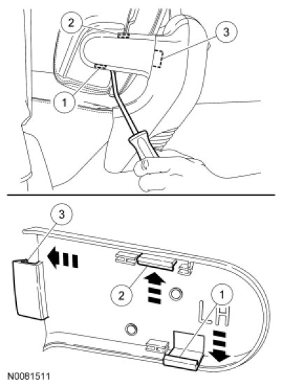 1. If equipped, insert a suitable tool into the LH pivot cover and attempt (push in) to reset the seat armrest locking pin. If the cover does not reset, proceed to Step 2.
