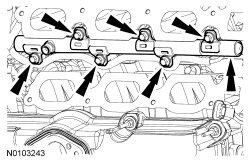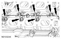 NOTE: When removing the fuel rails, the fuel injectors may remain in the fuel rails but normally remain lodged in the cylinder heads and require the use of a Fuel Injector Remover to extract.