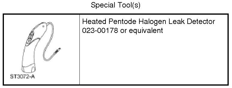 Leak test the refrigerant system using the Heated Pentode Halogen Leak Detector. Follow the instructions included with the Heated Pentode Halogen Leak Detector for handling and operation techniques.