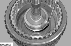 99. NOTICE: Only compress the direct clutch piston return spring far enough to take the tension from the direct clutch cylinder off the snap ring. If the piston is compressed too far, the piston alignment tab may be broken off.