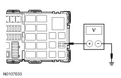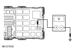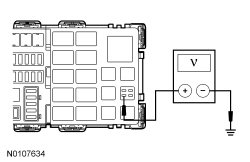 - Measure the voltage between the automatic high beam control relay pin 5, circuit SBB15 (WH/RD), BJB (Battery Junction Box) face side and ground.