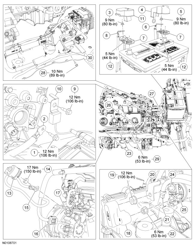 9. Detach the battery cable harness locator clip from the engine harness locator clip at the front corner of the LH valve cover.