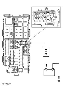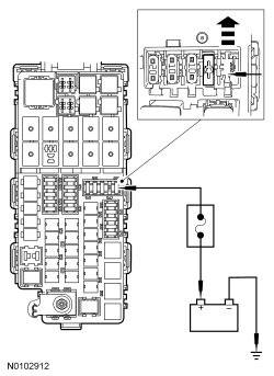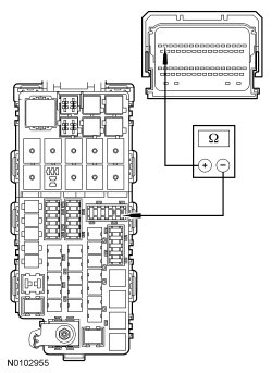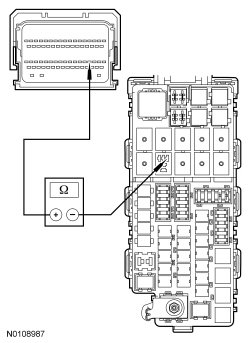 - Measure the resistance between the Battery Junction Box (BJB) starter relay pin 1, circuit CE336 (GN/WH), harness side and PCM C1381B-37, circuit CE336 (GN/WH), harness side.
