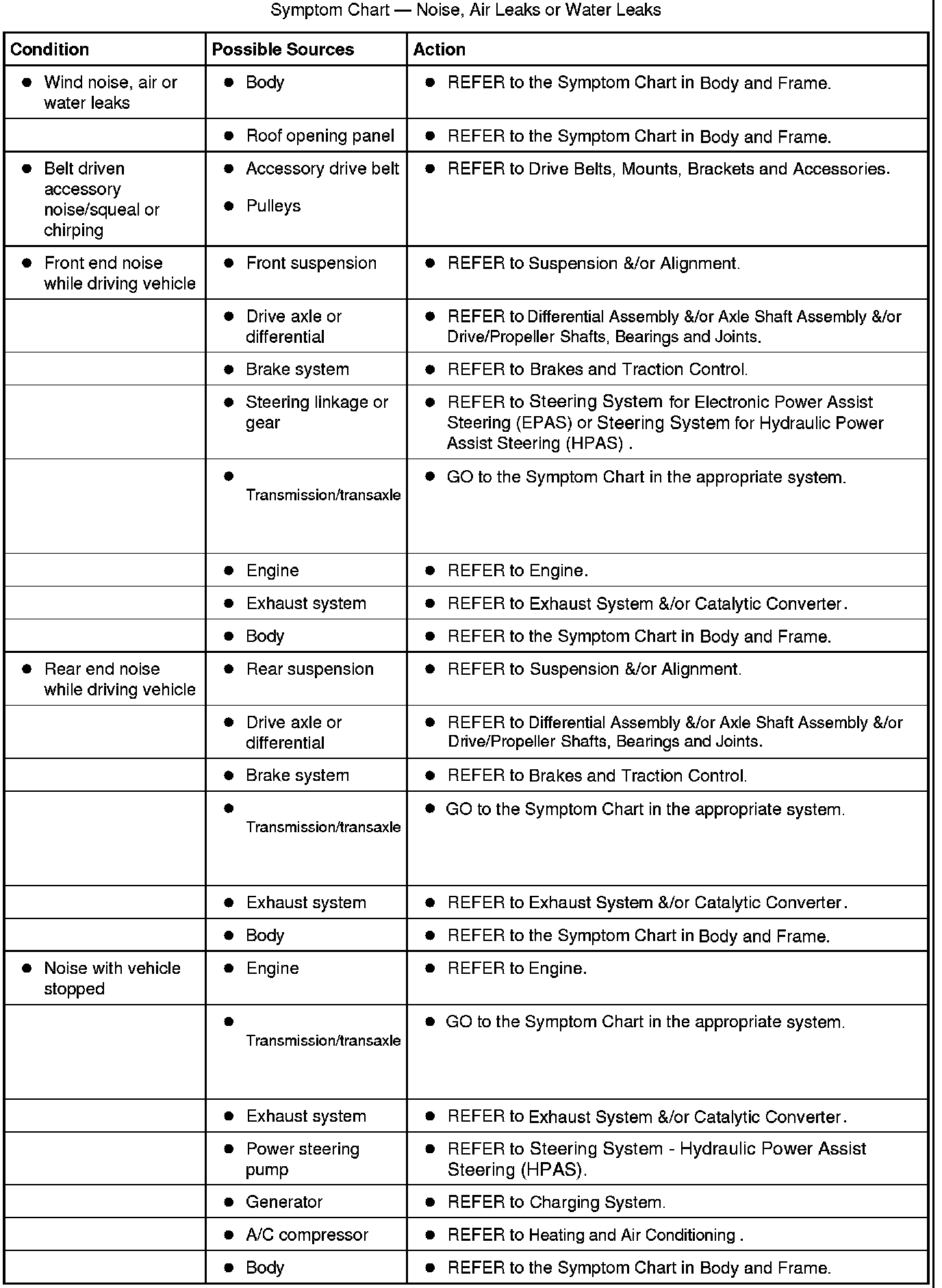 Symptom Chart - Noise, Air Leaks or Water Leaks