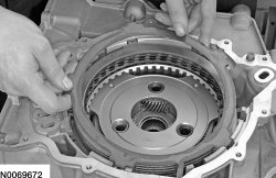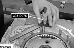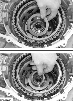 250. Measure the depth of the low/reverse clutch pressure plate where the tab fits into the gap of the low OWC (One-Way Clutch) snap ring and directly across from it. If the pressure plate is seated correctly, the depth should be the same. If the depths are different, rotate the snap ring so that the gap fits around the tab on the pressure plate.