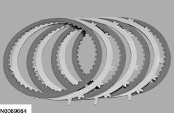 267. Position the overdrive/direct clutch assembly in the cover assembly, install the Dial Indicator Gauge with Holding Fixture 100-002 or a dial indicator and position the plunger on the overdrive clutch pressure plate. Apply 483 kPa (70 psi) of air pressure to the overdrive clutch piston port while recording the clutch pack clearance on the Dial Indicator Gauge. The clearance should be between 1.13 mm (0.044 in) and 2.28 mm (0.089 in). If the clearance is out of range, check the overdrive clutch pack for correct installation. If the overdrive clutch pack is correctly installed, install a new overdrive clutch pack.