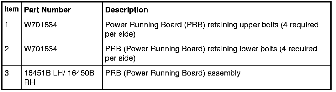 4. NOTICE: An assistant is required to hold the Power Running Board (PRB) before removing the lower bolts. Failure to follow this instruction may result in damage to the component.