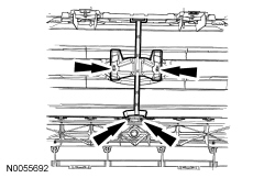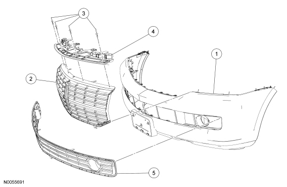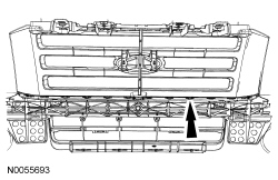 2. Remove the 4 bumper assembly-to-grille bracket retainer nuts and the bumper assembly-to-grille bracket.