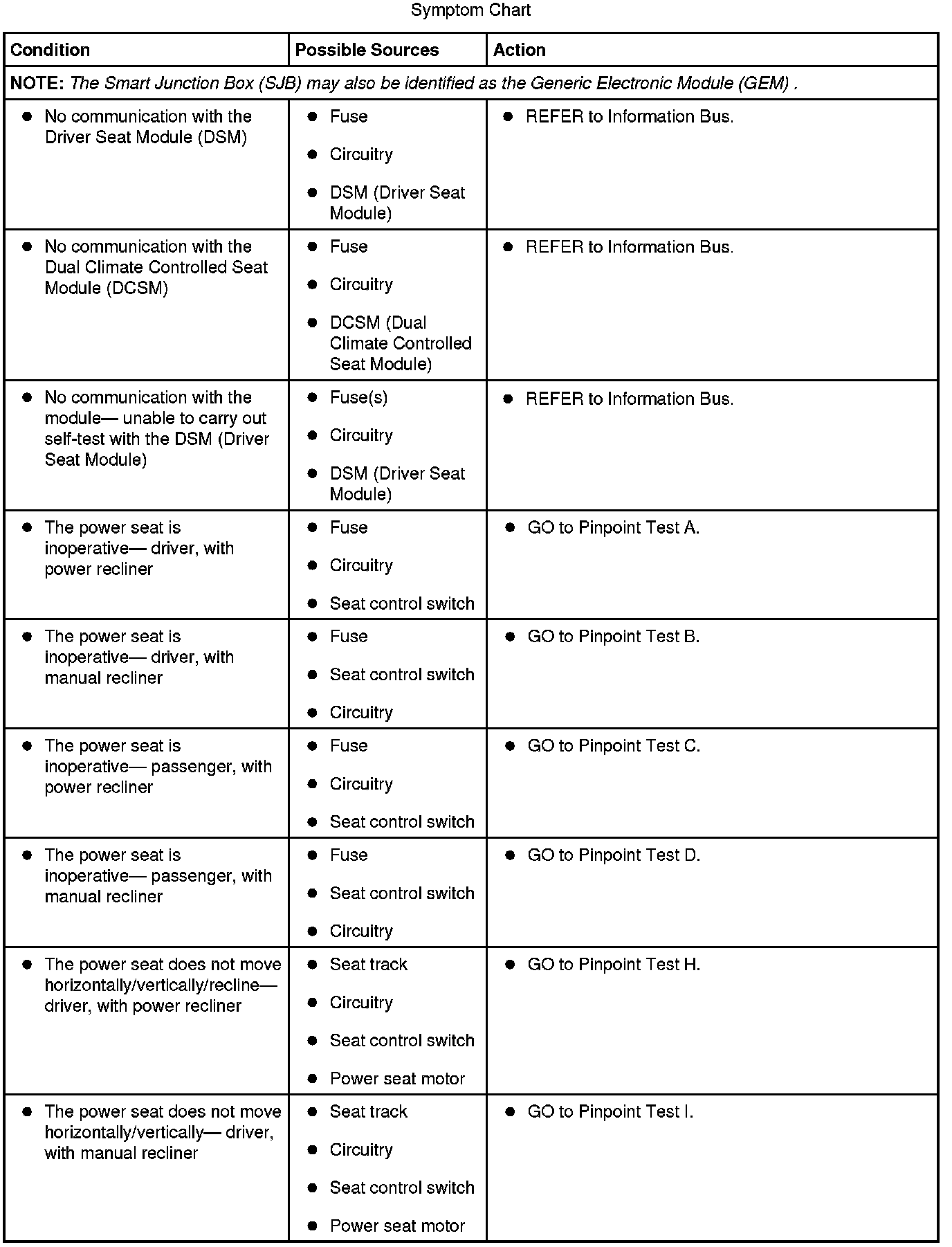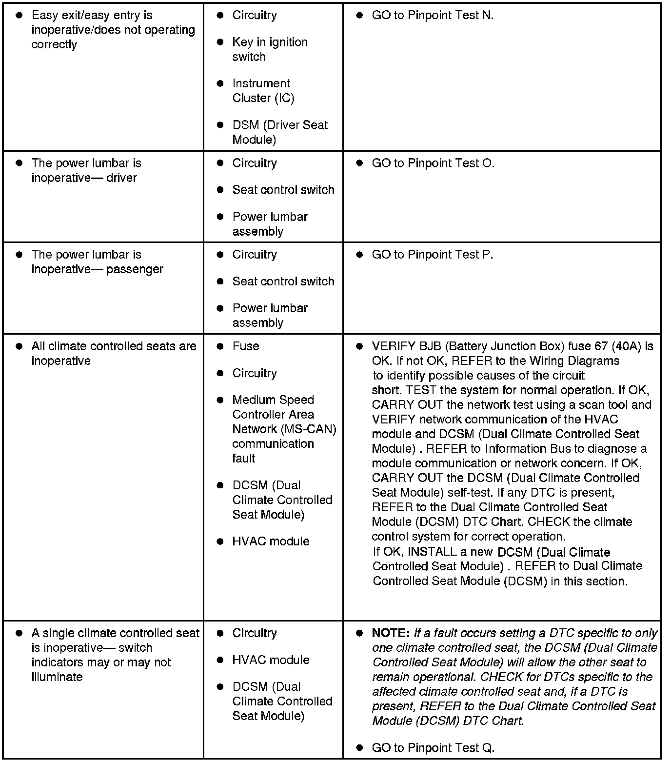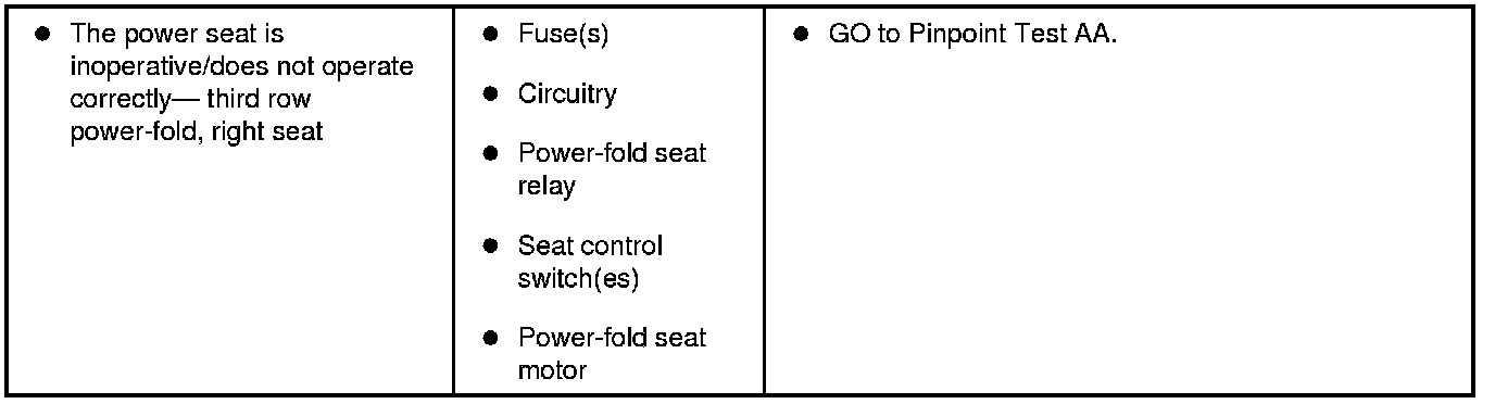 Refer to Inspection and Verification, the Driver Seat Module (DSM) DTC Chart, Dual Climate Controlled Seat Module (DCSM) DTC Chart, Smart Junction Box (SJB) DTC Chart and the Symptom Chart for direction to the appropriate pinpoint test. Inspection and Verification Seats
