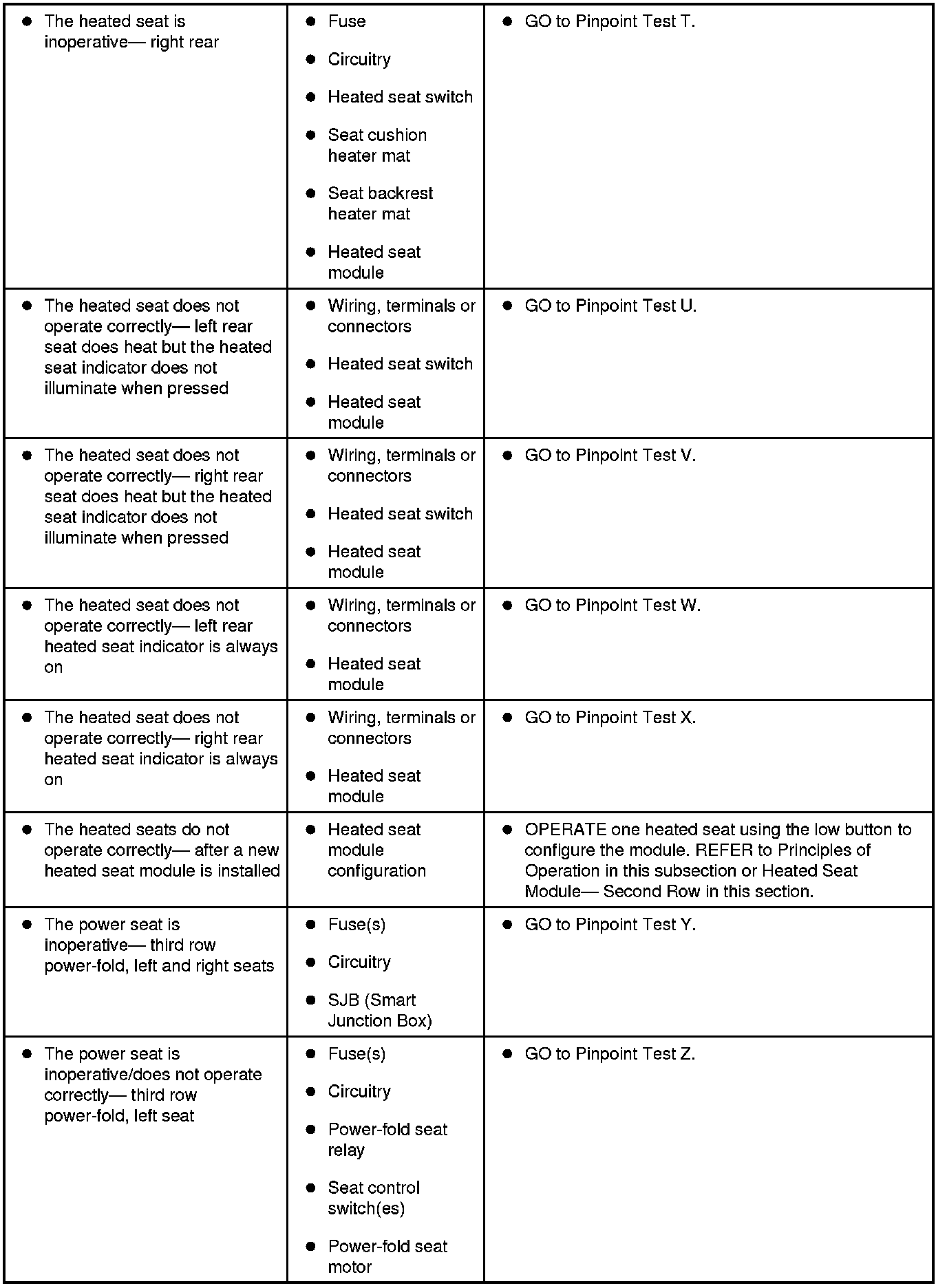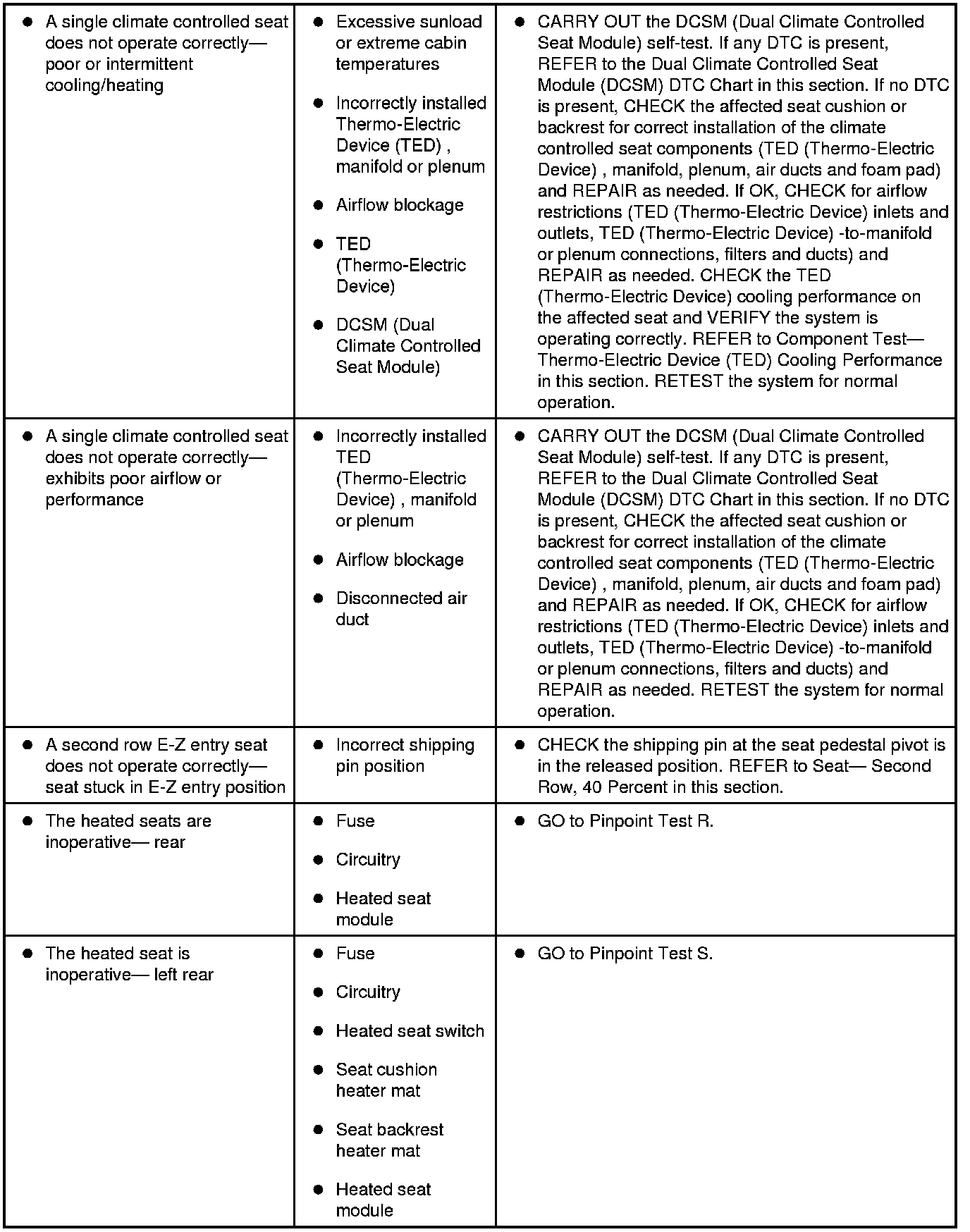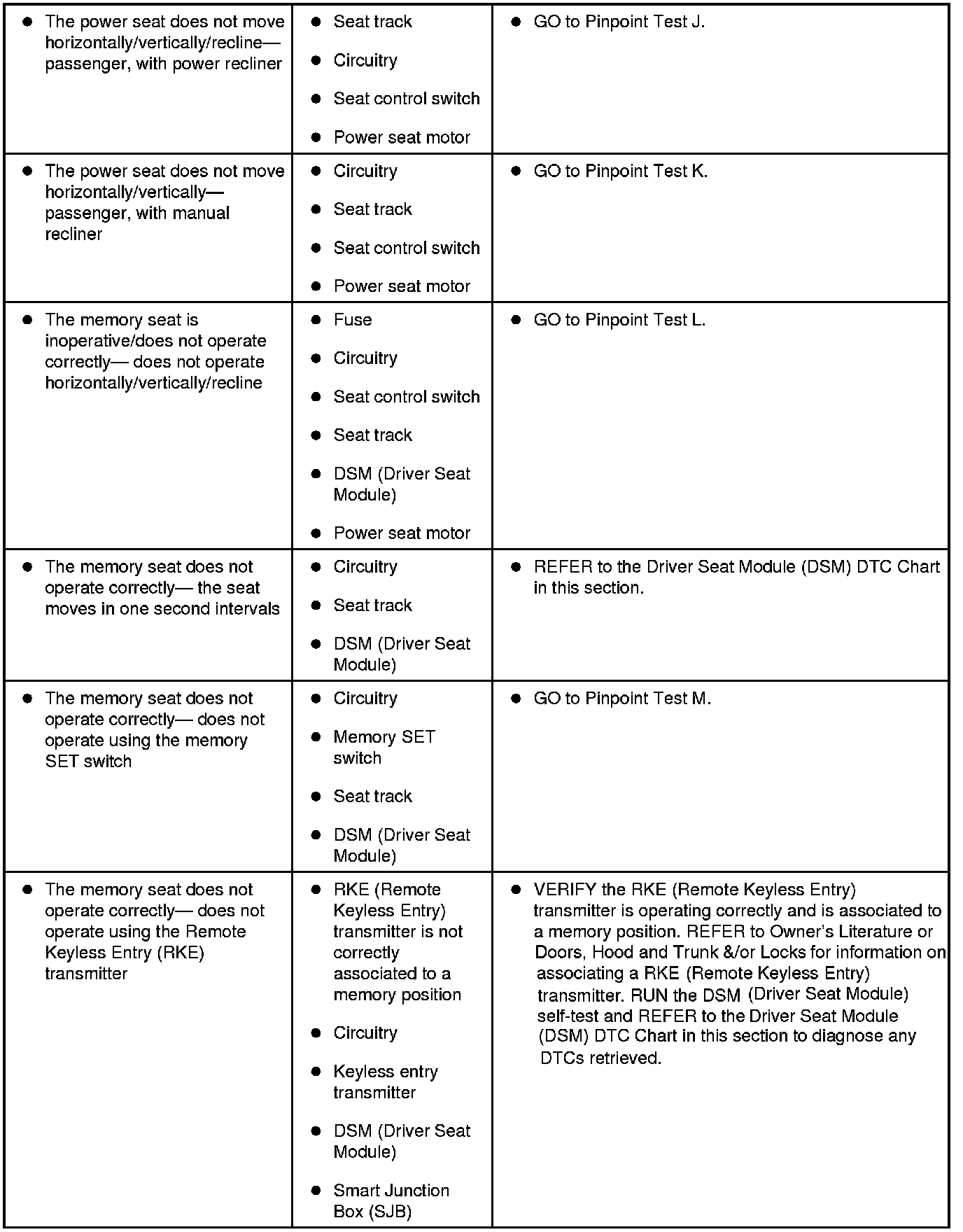 Refer to Inspection and Verification, the Driver Seat Module (DSM) DTC Chart, Dual Climate Controlled Seat Module (DCSM) DTC Chart, Smart Junction Box (SJB) DTC Chart and the Symptom Chart for direction to the appropriate pinpoint test. Inspection and Verification Seats