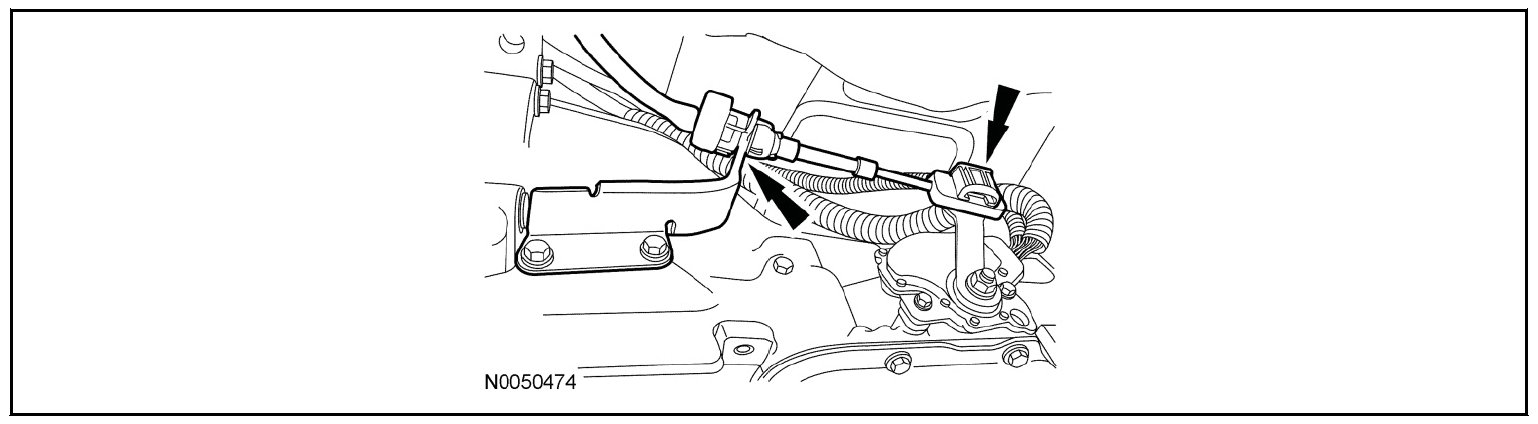 59. Disconnect the transmission electrical connector from the harness and the clip on the A/C line.