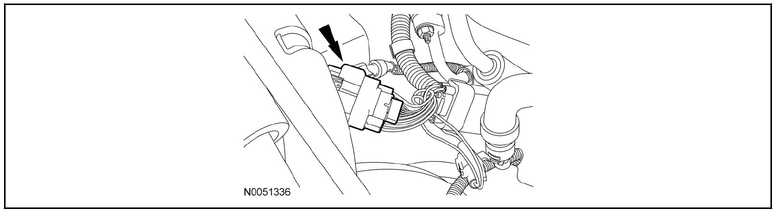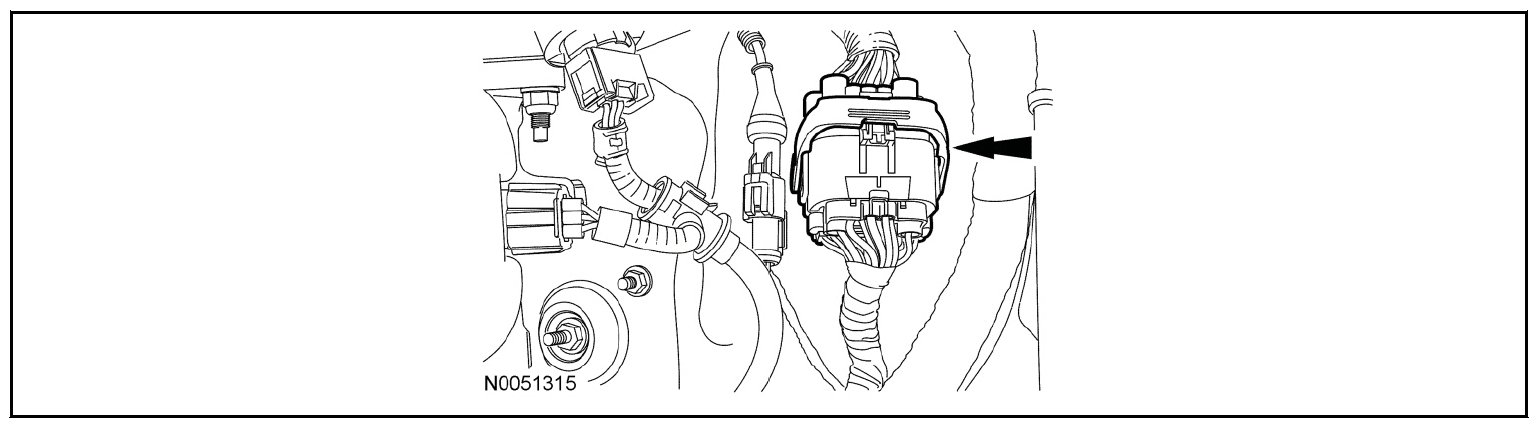 57. Disconnect the engine electrical connector from the PCM and remove the retainer from the bulkhead.