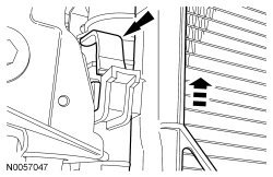 Depress the retaining tabs on the 2 lower condenser mounting brackets and raise the condenser assembly until the 4 condenser mounting brackets detach from the radiator.