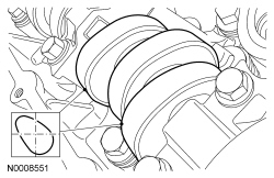 10. NOTICE: If one or both tensioner mounting bolts are loosened or removed, the tensioner-sealing bead must be inspected for seal integrity. If cracks, tears, separation from the tensioner body or permanent compression of the seal bead is observed, install a new tensioner or engine damage may occur.