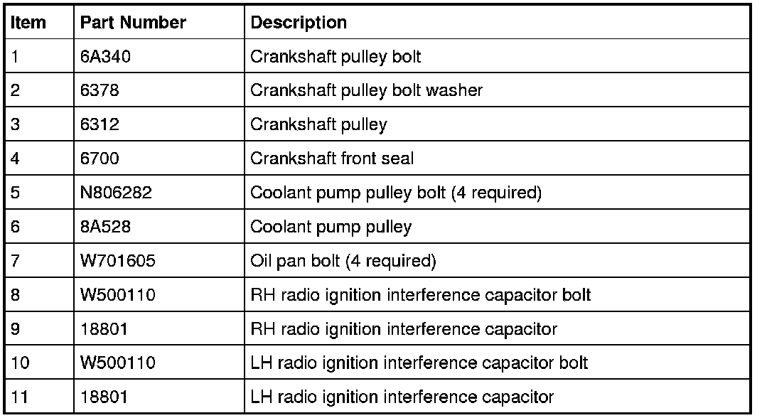 Radio Ignition Interference Capacitors, Coolant Pump Pulley, Crankshaft Pulley and Front Oil Pan Bolts