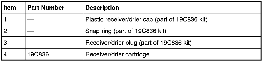 NOTE: Installation of a new receiver/drier desiccant cartridge is not required when repairing the A/C system, except when there is physical evidence of contamination from a failed A/C compressor or damage to the receiver/drier desiccant cartridge. Damage to the receiver/drier desiccant cartridge includes physical damage to the receiver/drier desiccant cartridge or moisture contamination. Moisture contamination results only from a complete loss of refrigerant and equalization of the refrigerant system pressure with atmospheric pressure for a period longer than one hour. If even a slight amount of positive refrigerant pressure is present in the system before repairs are carried out, the receiver/drier desiccant cartridge should not be replaced.