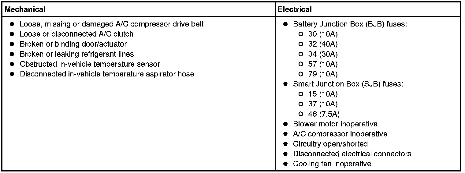 If any HVAC module- DATC (Dual Automatic Temperature Control) DTCs retrieved are related to the concern, go to the HVAC Module- Dual Automatic Temperature Control (DATC) DTC Chart. Heating and Air Conditioning If any HVAC module- EMTC (Electronic Manual Temperature Control) DTCs retrieved are related to the concern, go to the HVAC Module- Electronic Manual Temperature Control (EMTC) DTC Chart. Heating and Air Conditioning If the PCM DTCs retrieved are related to the concern, go to the PCM DTC Chart. Heating and Air Conditioning For all other DTCs, refer to Body Control Systems.