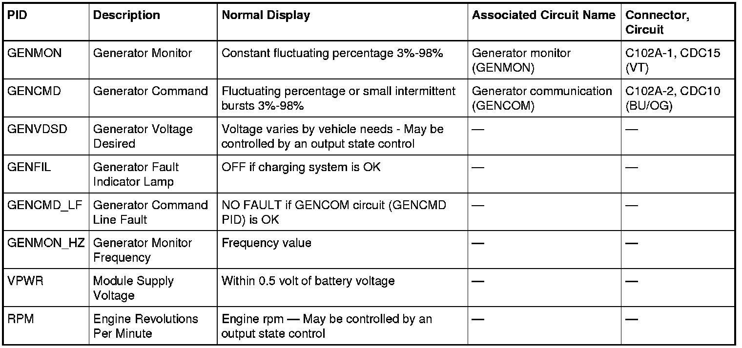 The PIDs and their associated descriptions used in the charging system diagnosis are listed below: