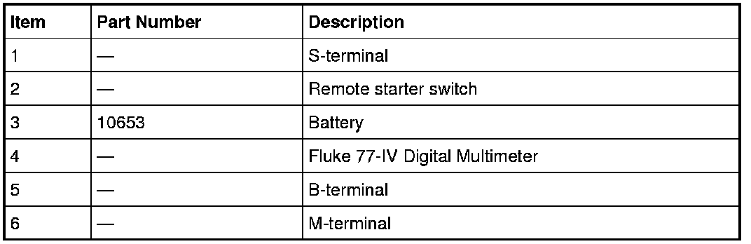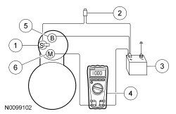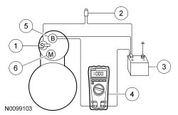 8. Remove the cables from solenoid B, S and M-terminals. Clean the cables and connections and reinstall the cables to the correct terminals. Repeat Steps 3 through 6. If the voltage drop reading is still greater than 0.5 volt when checked at the M-terminal and less than 0.5 volt when checked at the B-terminal, the concern is in the solenoid contacts. Install a new starter motor.