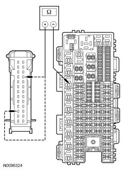 - Measure the resistance between rear window defrost relay socket pin 2, circuit CH122 (WH/OG), harness side and C228B-23 (HVAC module- Electronic Automatic Temperature Control (EATC)) or C2357B-23 (HVAC module- Electronic Manual Temperature Control (EMTC)) circuit CH122 (WH/OG), harness side.