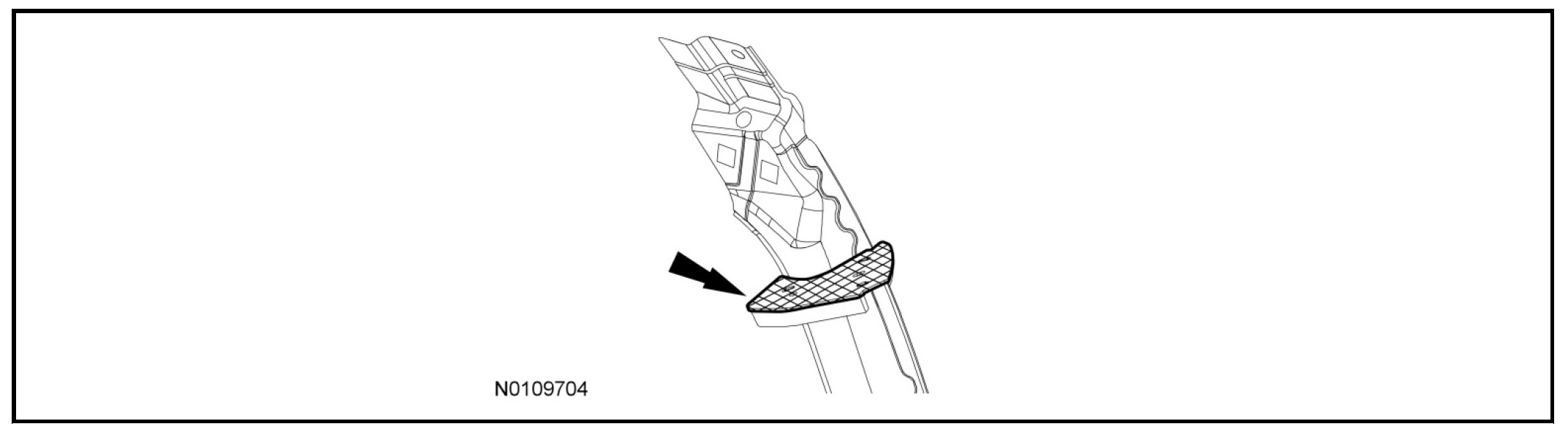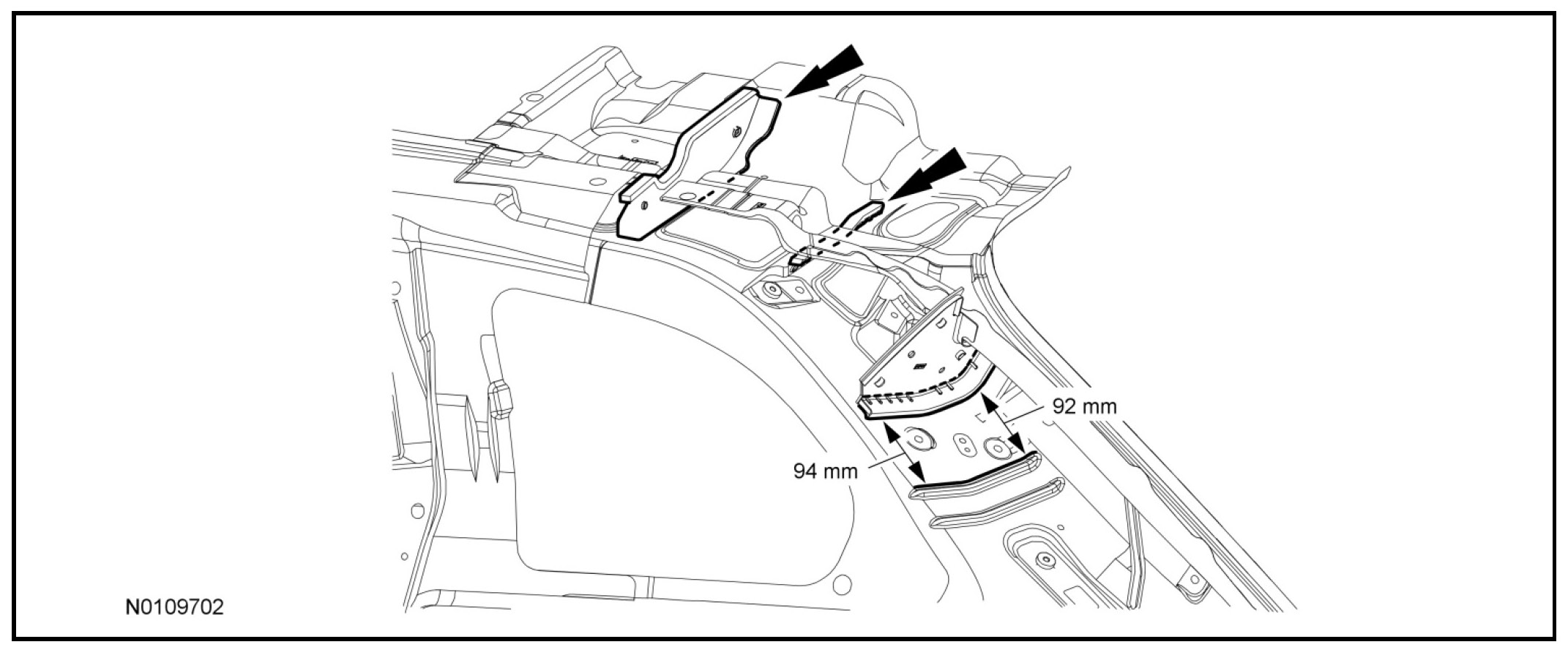 5. Apply metal bonding adhesive to the baffle flange as indicated, build a bead 7 mm (0.275 in) to 9 mm (0.354 in) thick, to create full contact with the body side assembly. Install the liftgate header brackets and apply metal bonding adhesive to the header brackets.