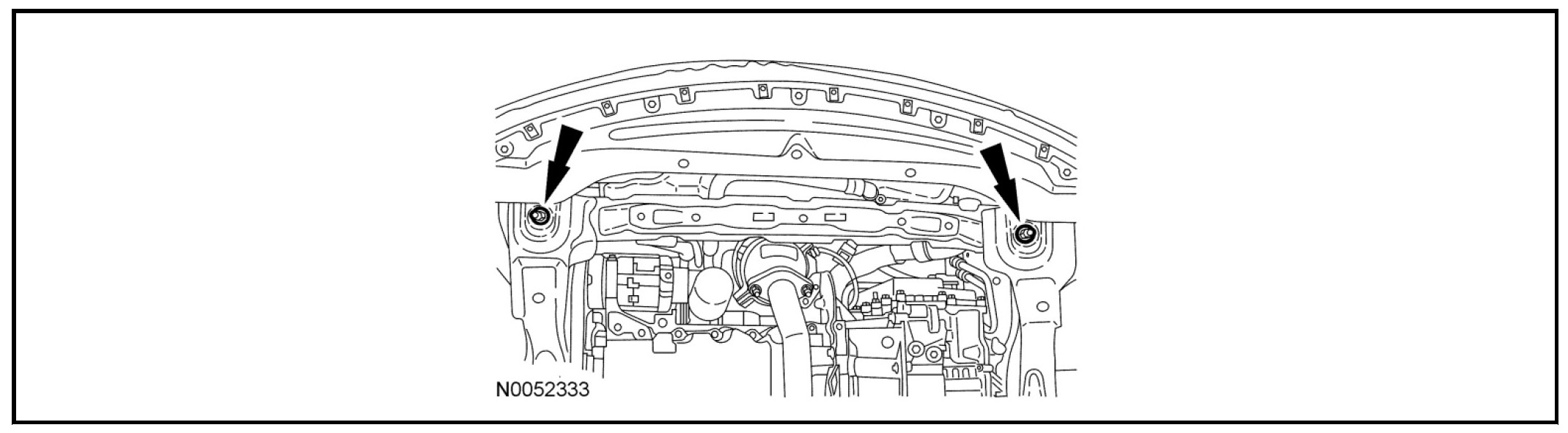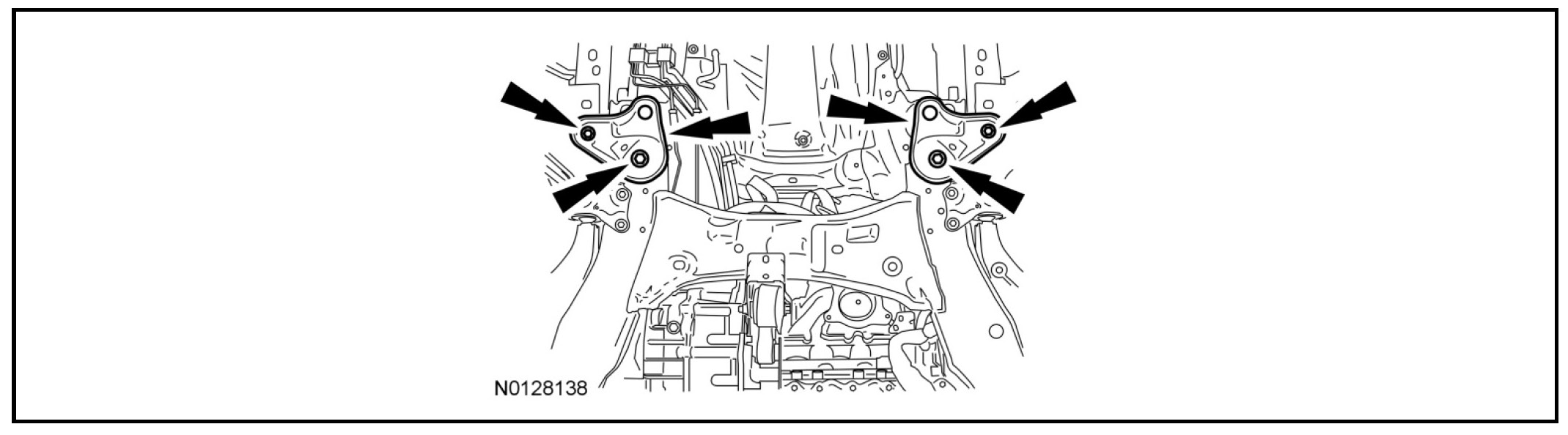 Remove and discard the 2 crossbrace-to-front subframe support bracket bolts and remove the crossbrace.
