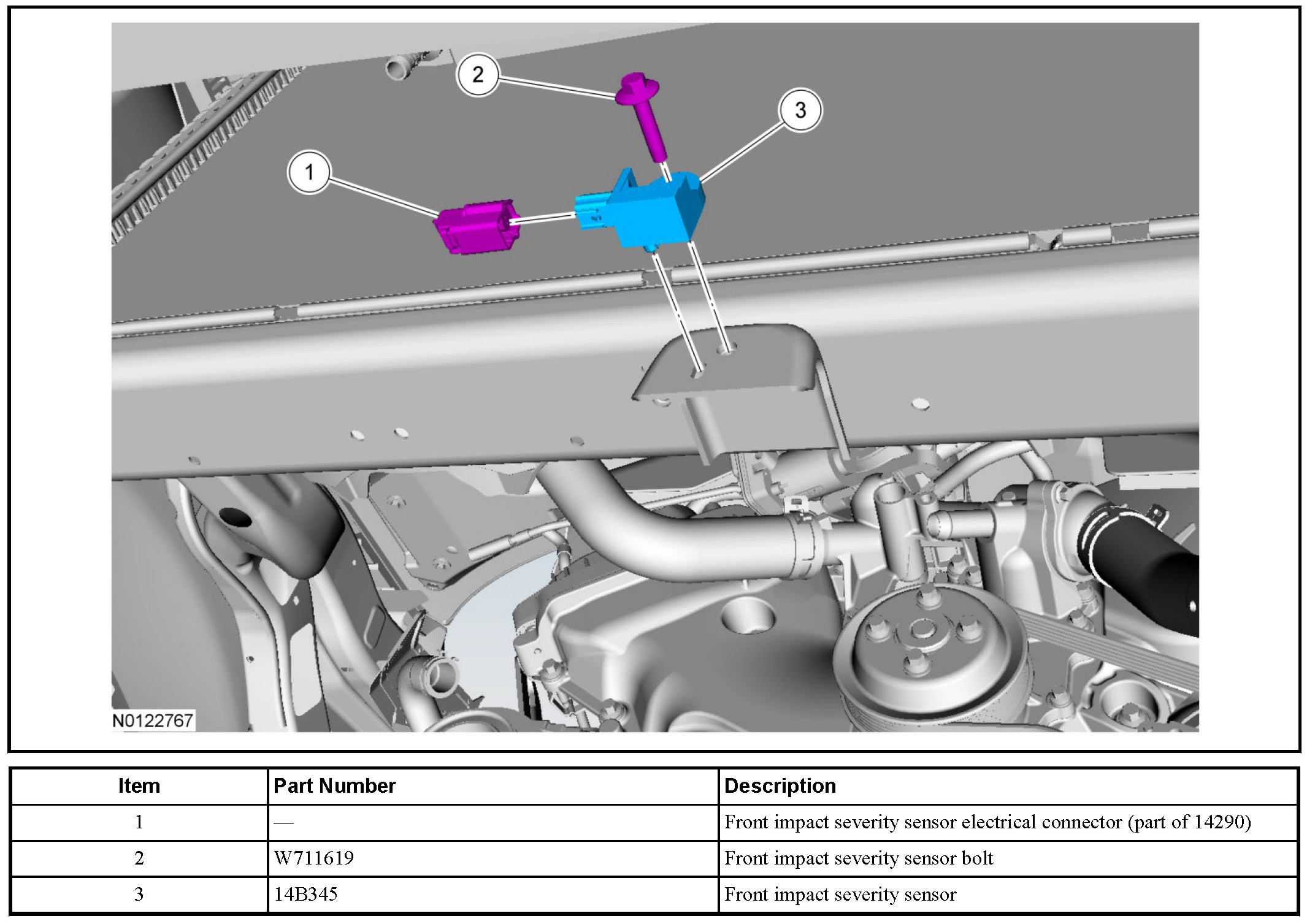 NOTE: Make sure the radiator support and front impact severity sensor mating surfaces are clean and free of foreign material.