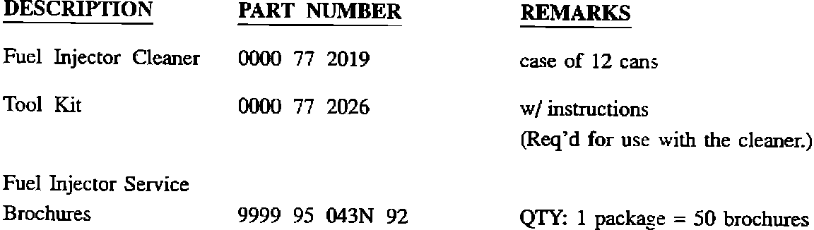 Mazda's Fuel Injector Cleaner and Fuel Injection Tool Kit are available through the Parts Department. Also available is a Fuel Injector Service Brochure that is free of charge from Helm, Inc. (1-800-782-4356). This brochure outlines to your customer the importance and advantages of a clean fuel injection system. Refer to the part numbers when ordering: