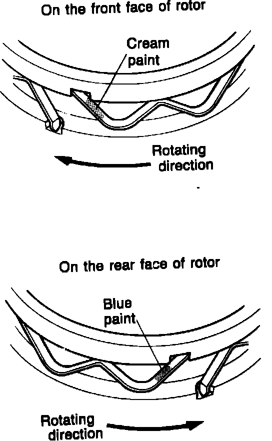 2. Install the oil seal springs in their respective grooves on the rotor with each round edge of the spring fitted in the stopper hole in the oil seal grooves as shown in Fig. 28. The oil seal springs have been painted in cream or blue color. The cream-painted springs should be fitted on the front faces of both front and rear rotors. While the blue-painted springs should be fitted on the rear faces, Fig. 29.
