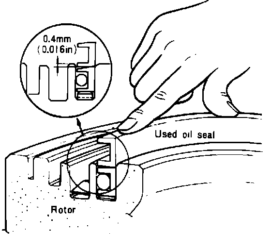5. Press the inner oil seal by using a used inner oil seal so that the lip surface of the oil seal sinks into a position approximately 0.016 in. (0.4 mm) below the surface of the rotor, as shown in Fig. 30.