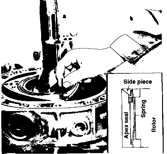 2. Install apex seals without spring and side piece into their respective grooves so that side piece positions to the rear side of rotor, Figs. 31 and 32.