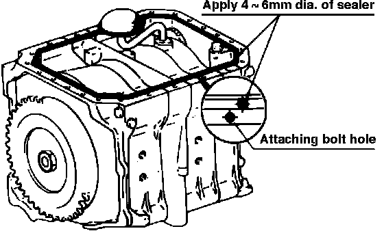4. Apply the 0.16-0.24 in. (4-6 mm) diameter continuous bead of sealer (Part number 0398 77 739) on the mounting surface of the oil pan as shown in Fig. 52. Be sure there are no gaps in the sealer bead.