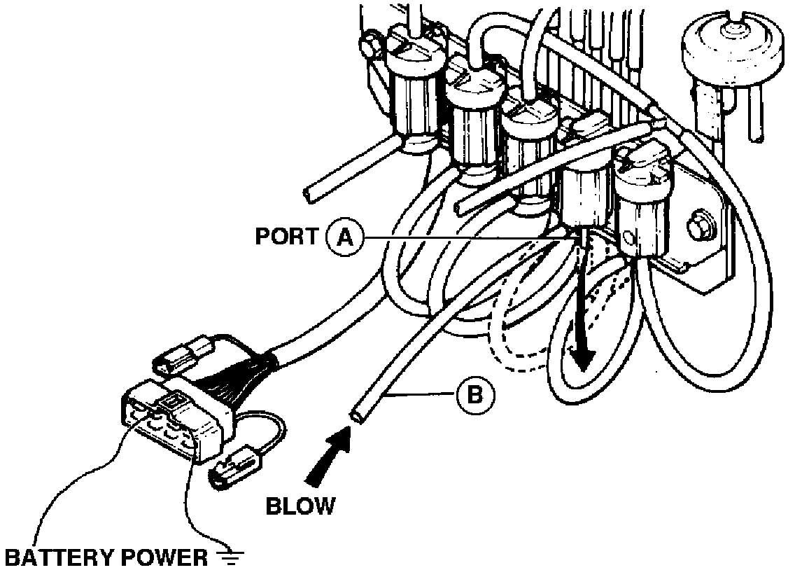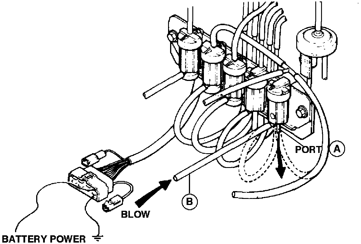 3. Start engine and increase engine speed to 1,200 RPM. Blow air through the solenoid valve from vacuum hose (B). Ensure air flows through solenoid valve and out from port (a), Fig. 41. If no air flow, replace three way solenoid valve.