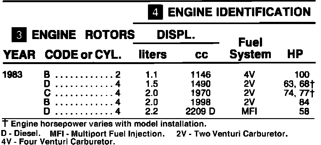 (4) ENGINE IDENTIFICATION: On the line where the engine code appears, read to the right to identify the engine.