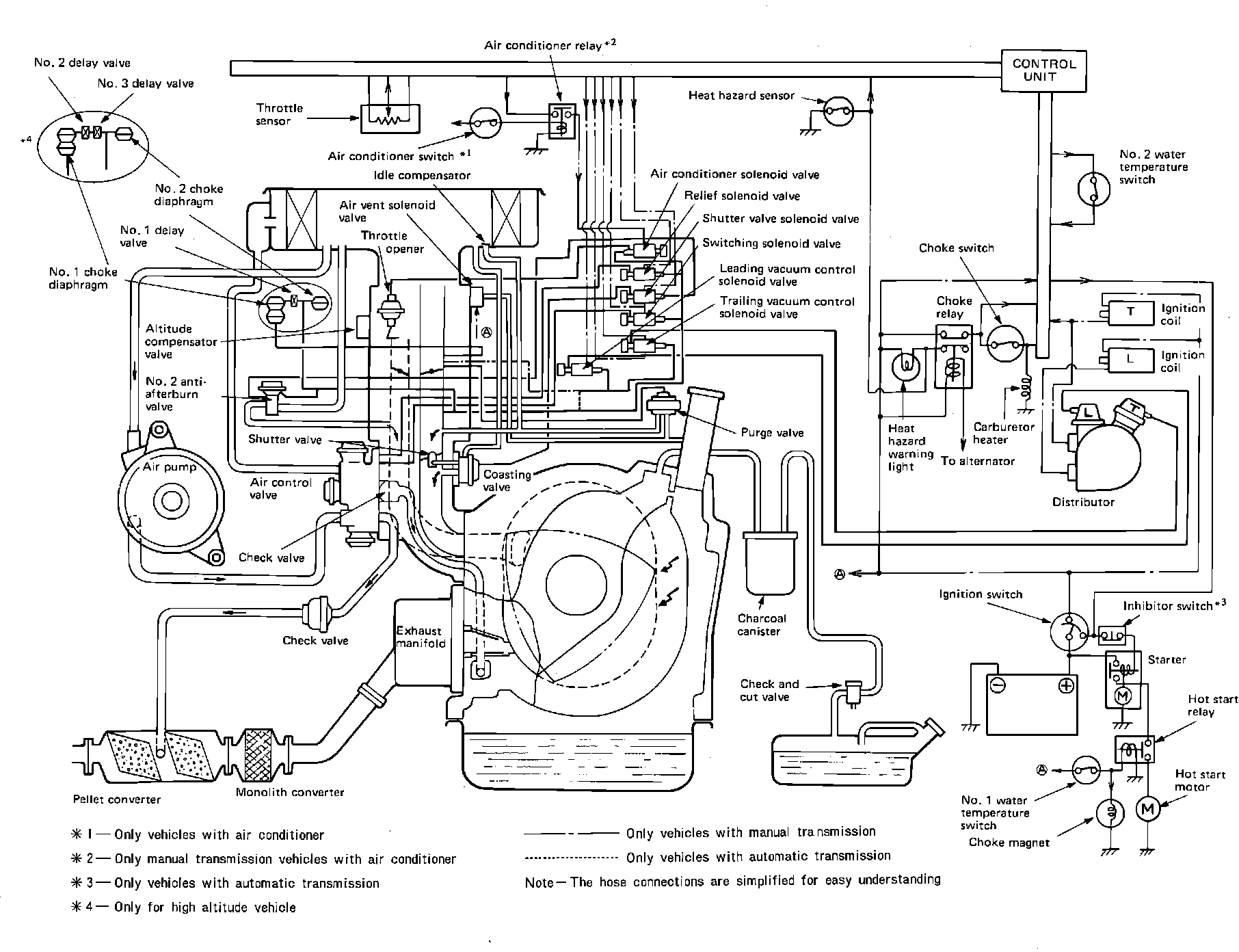 The engine control system is used to supplement and aid the conventional emission system. The system consist of an engine control unit, temperature switches, a choke switch (magnet and relay), and various control solenoids and valves. These components are used to regulate vacuum via signals from the control unit.