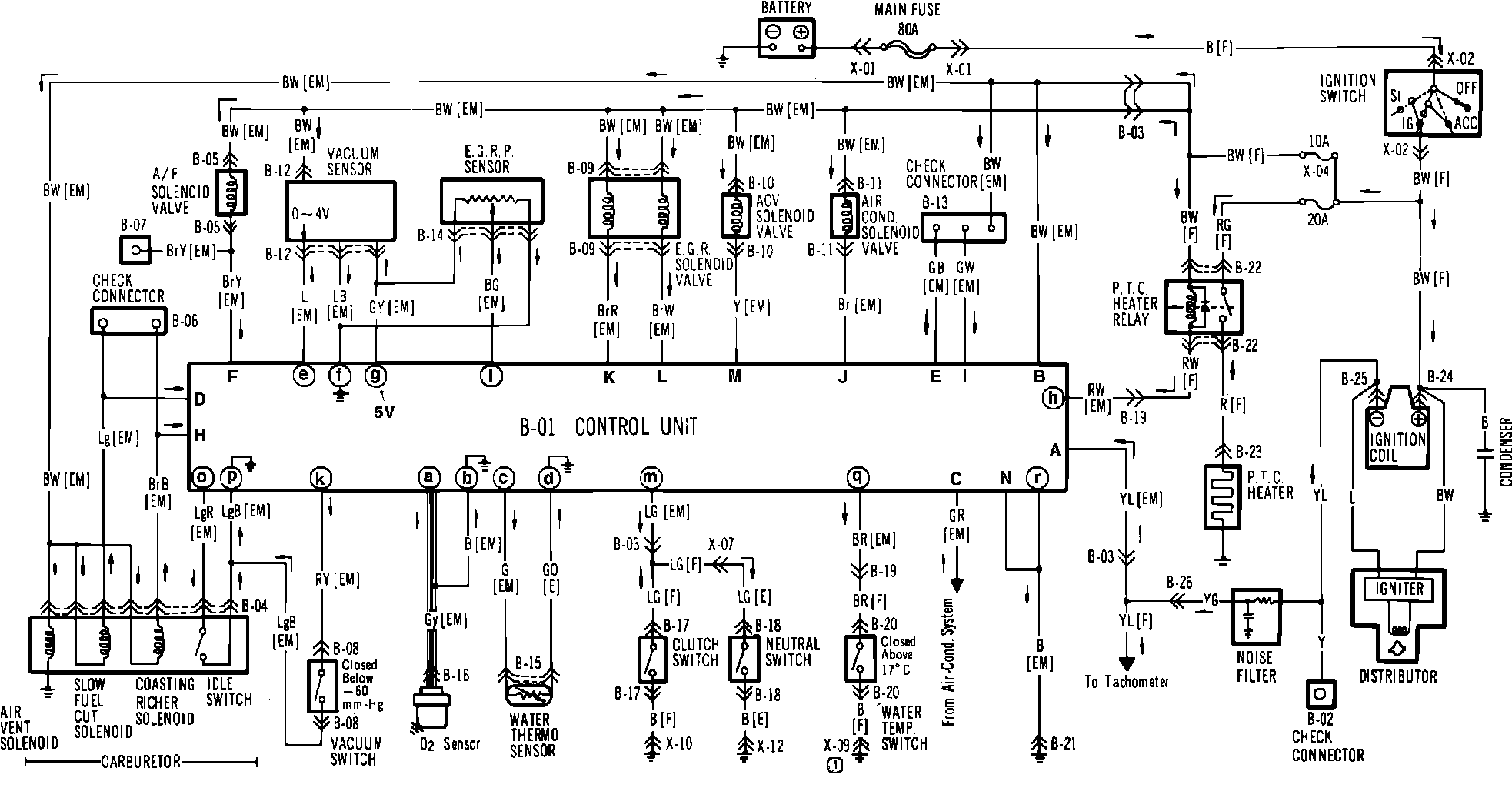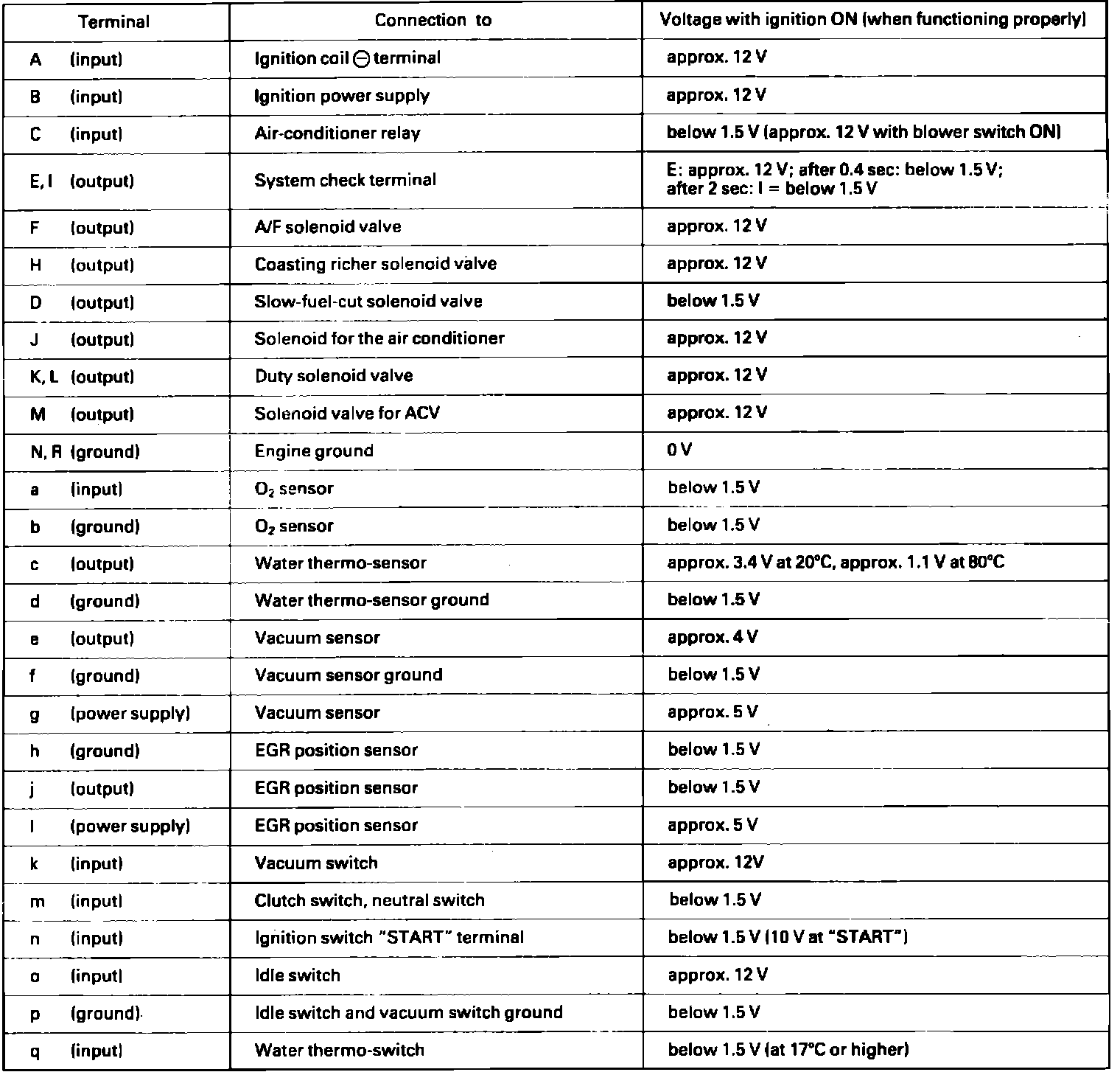 2. With ignition switch ON and engine OFF, measure voltage at each terminal and compare values listed in Fig. 2. Refer to Fig. 1, for terminal locations.