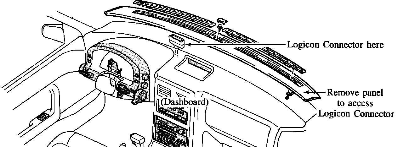 The main connector to the Logicon unit is located under the trim panel at the inside base of the windshield. This connector can be reached easier and faster by removing the trim panel.
