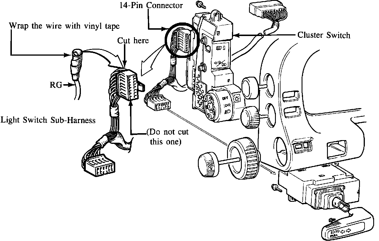 2. If you do not replace the light switch sub-harness, cut off the RG wire to the 14-pin connector as shown in the illustration below. Then, wrap the wire with vinyl tape to prevent short circuiting.