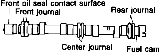 Inspect fuel cam for excessive wear and/or damage. Measure fuel cam height. Fuel cam height should be 1.331-1.346 inch. Replace camshaft assembly if measurements obtained are not to specifications. Inspect camshaft deflection by placing camshaft front and rear journals on suitable V-blocks. Using a suitable dial indicator, place dial indicator pointer on to camshaft center journal assembly. Rotate camshaft and measure deflection. Camshaft deflection should be .0012 inch. If not, replace camshaft assembly.