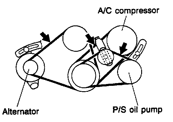 Adjust drive belt deflection. To check the drive belt tension, apply moderate pressure (98 N, 10 kg, 22 lb) between the pulleys as shown in the figure.