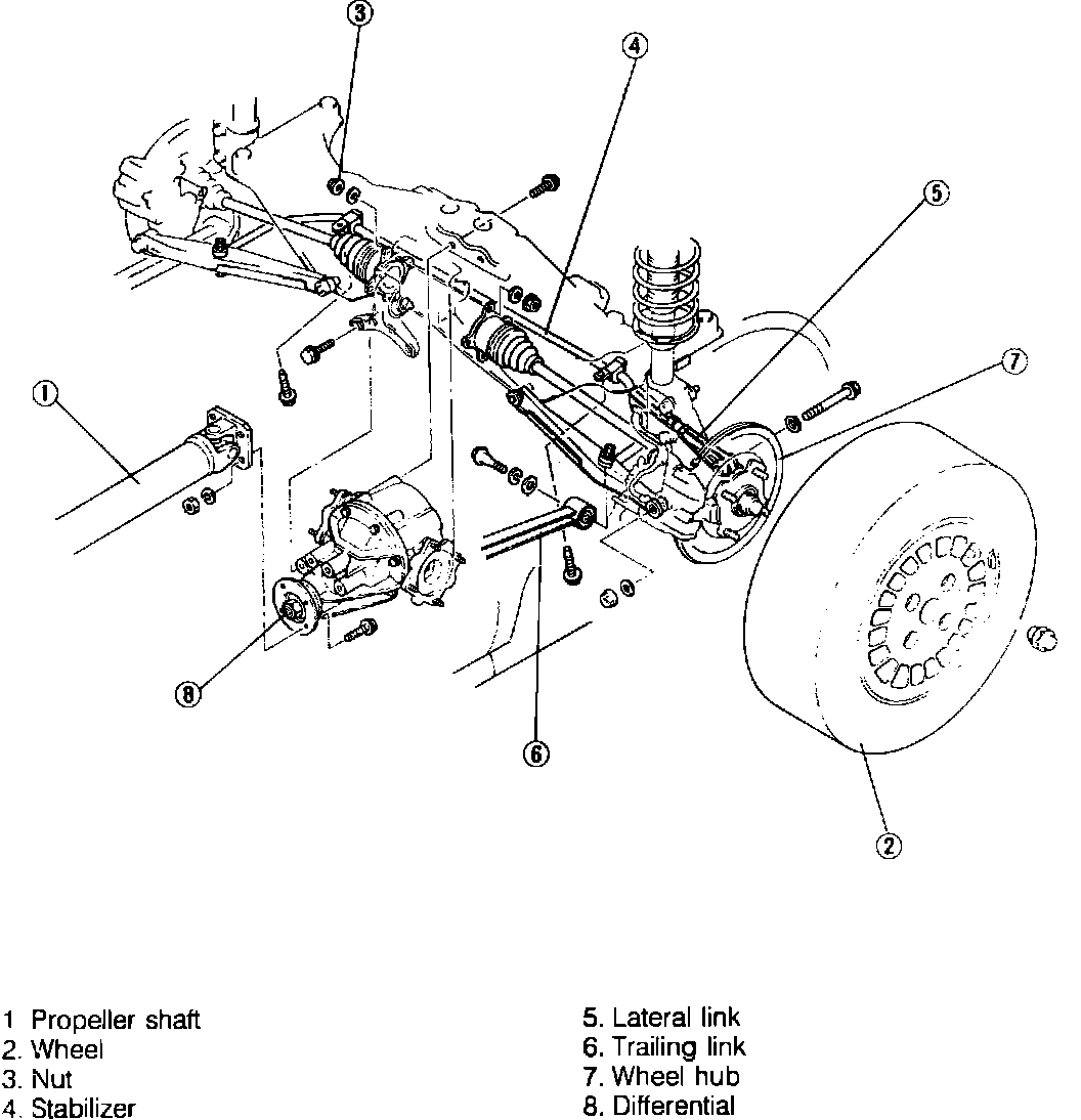 6. Remove lateral link. Be careful when disconnecting bolt and nut, as lateral link may be under tension.