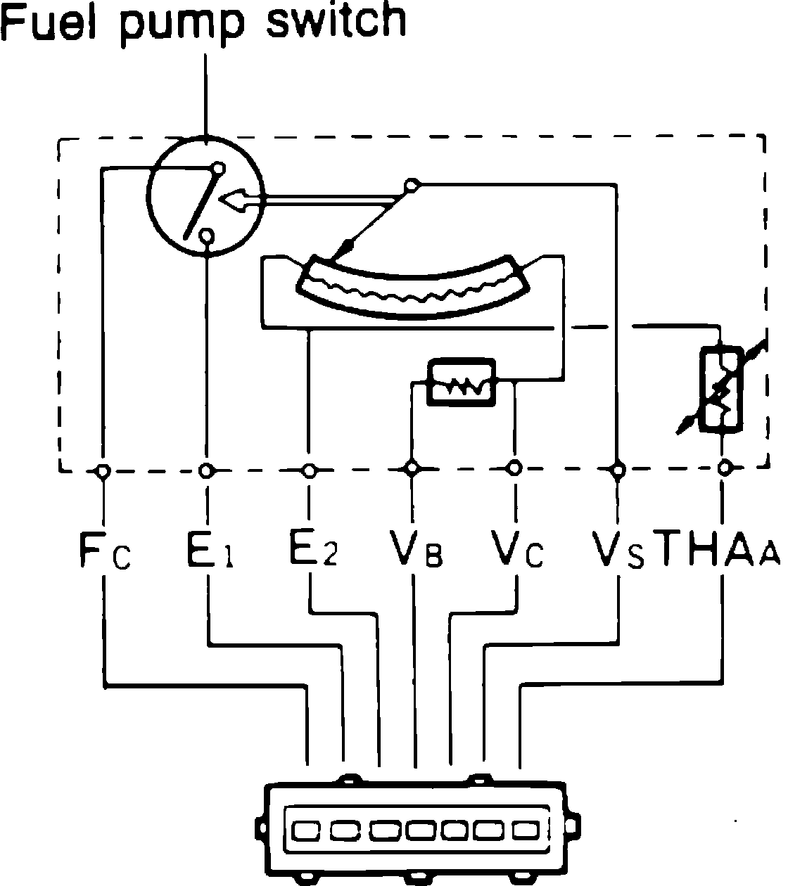 4. Using ohmmeter, check resistance between terminals, Fig. 28, with measuring plate fully closed and fully open. There should be 20-400 ohms between terminals E2 and VS with plate fully closed and 20-1000 ohms with plate fully open, 100-400 ohms between terminals E2 and VC regardless of plate position and 200-400 ohms between terminals E2 and VB regardless of plate position. Resistance between terminals E2 and THA, regardless of plate position, should be 13.6-18.4k ohms at -4°F, 2.21-2.69k ohms at 68°F and 493-667 ohms at 140°F. Resistance between terminals E1 and FC should be infinite with plate fully closed and zero ohms with plate fully open.